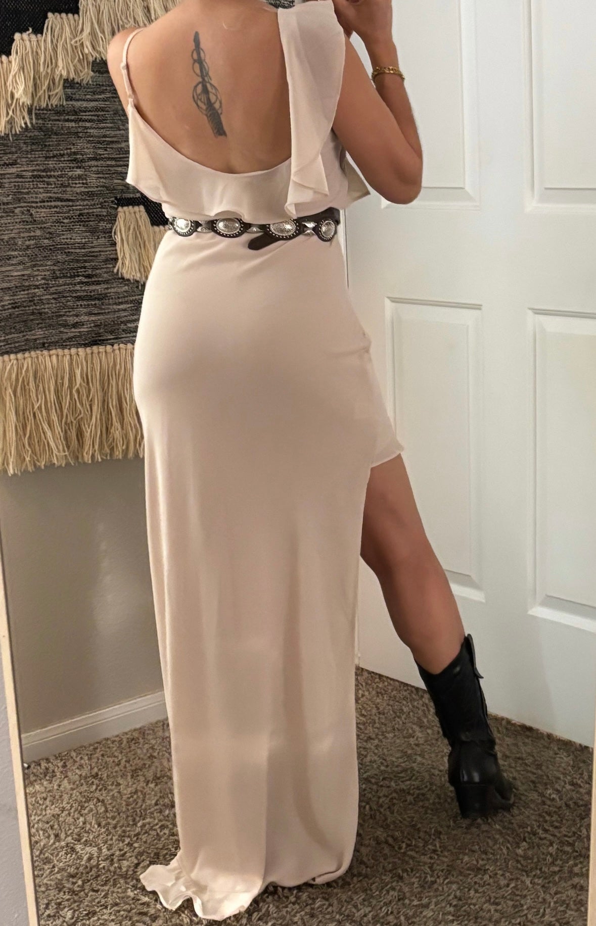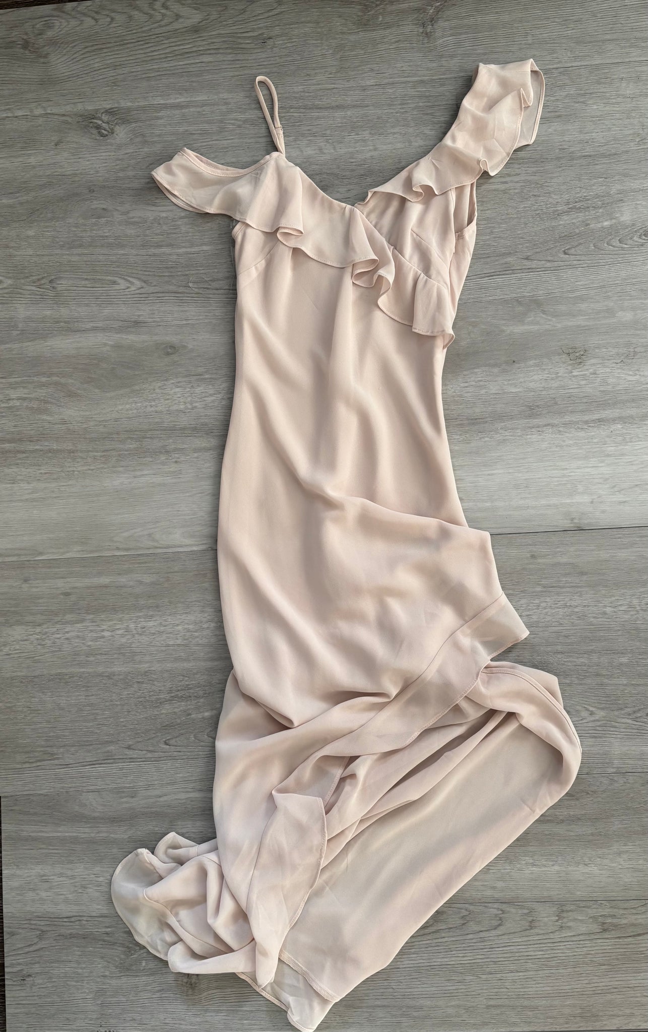 Asymmetrical slub knit maxi dress with ruffles at the neckline and skirt. It features adjustable thin straps, a V-neckline, and a deep asymmetrical front slit.