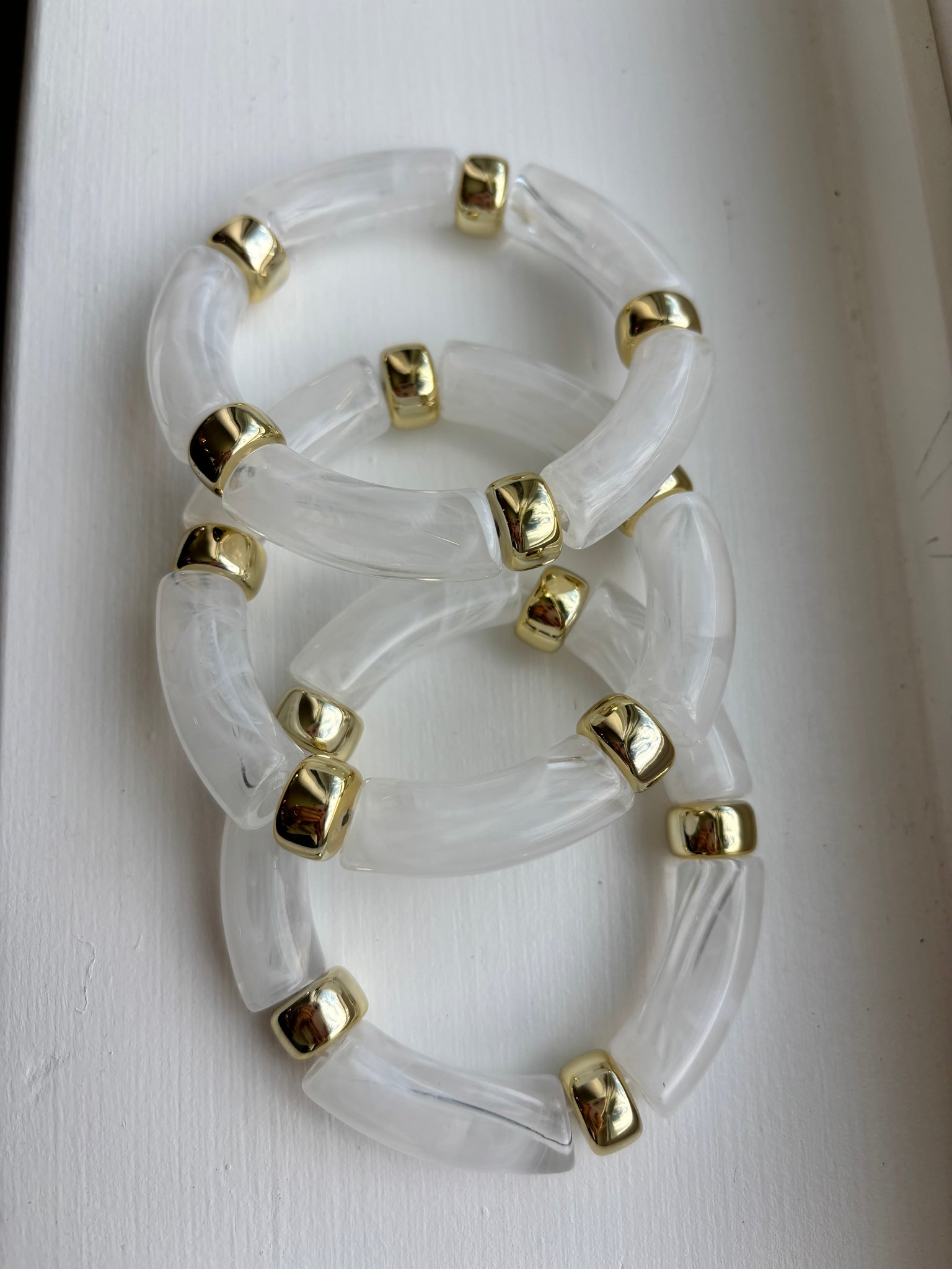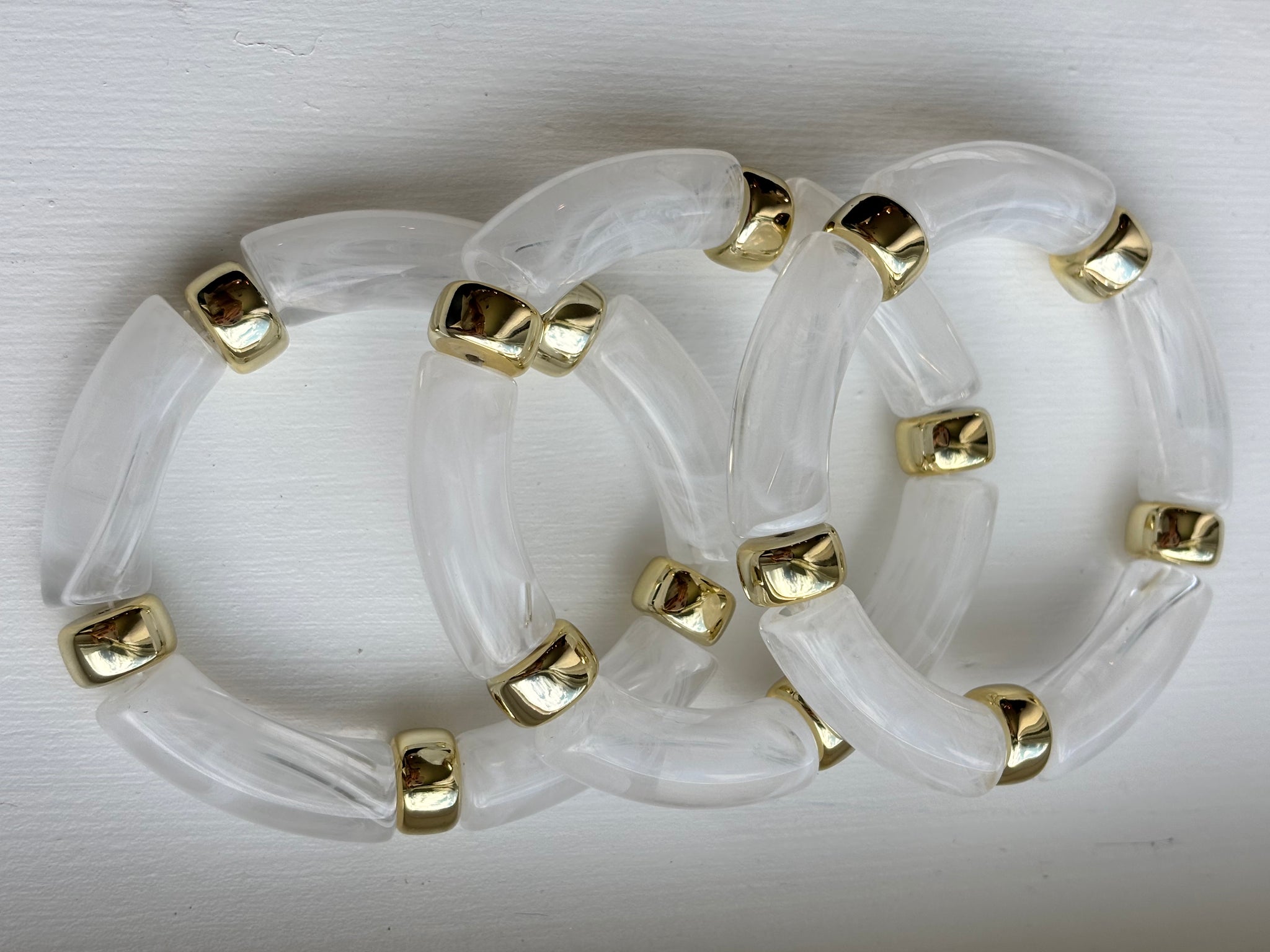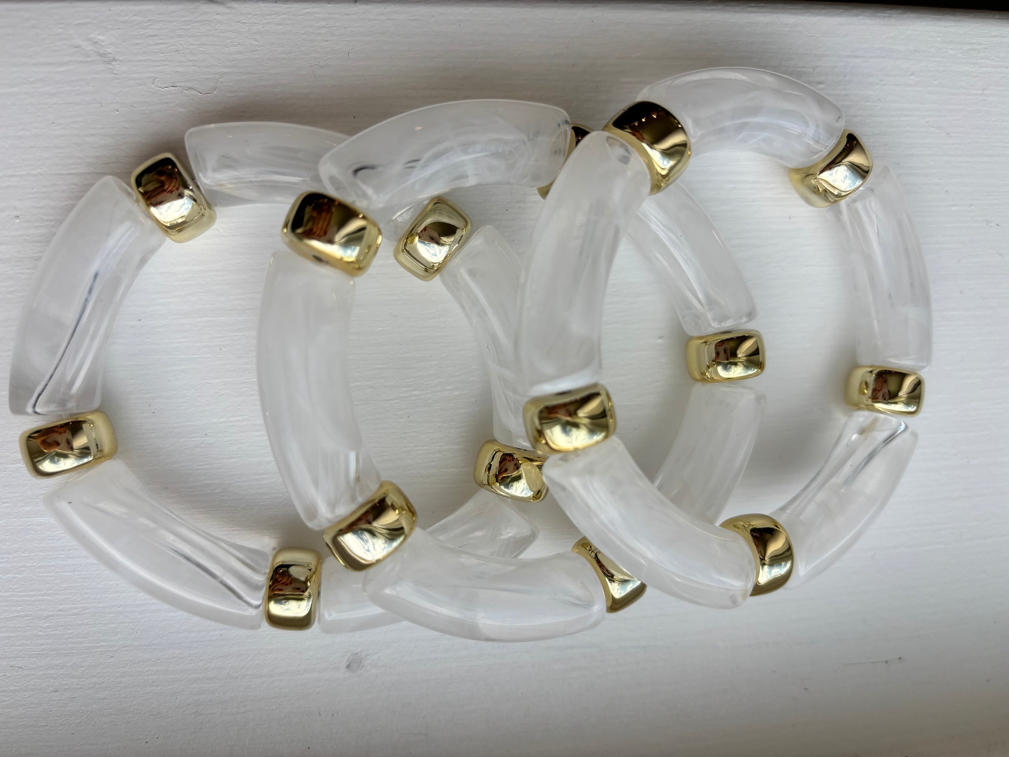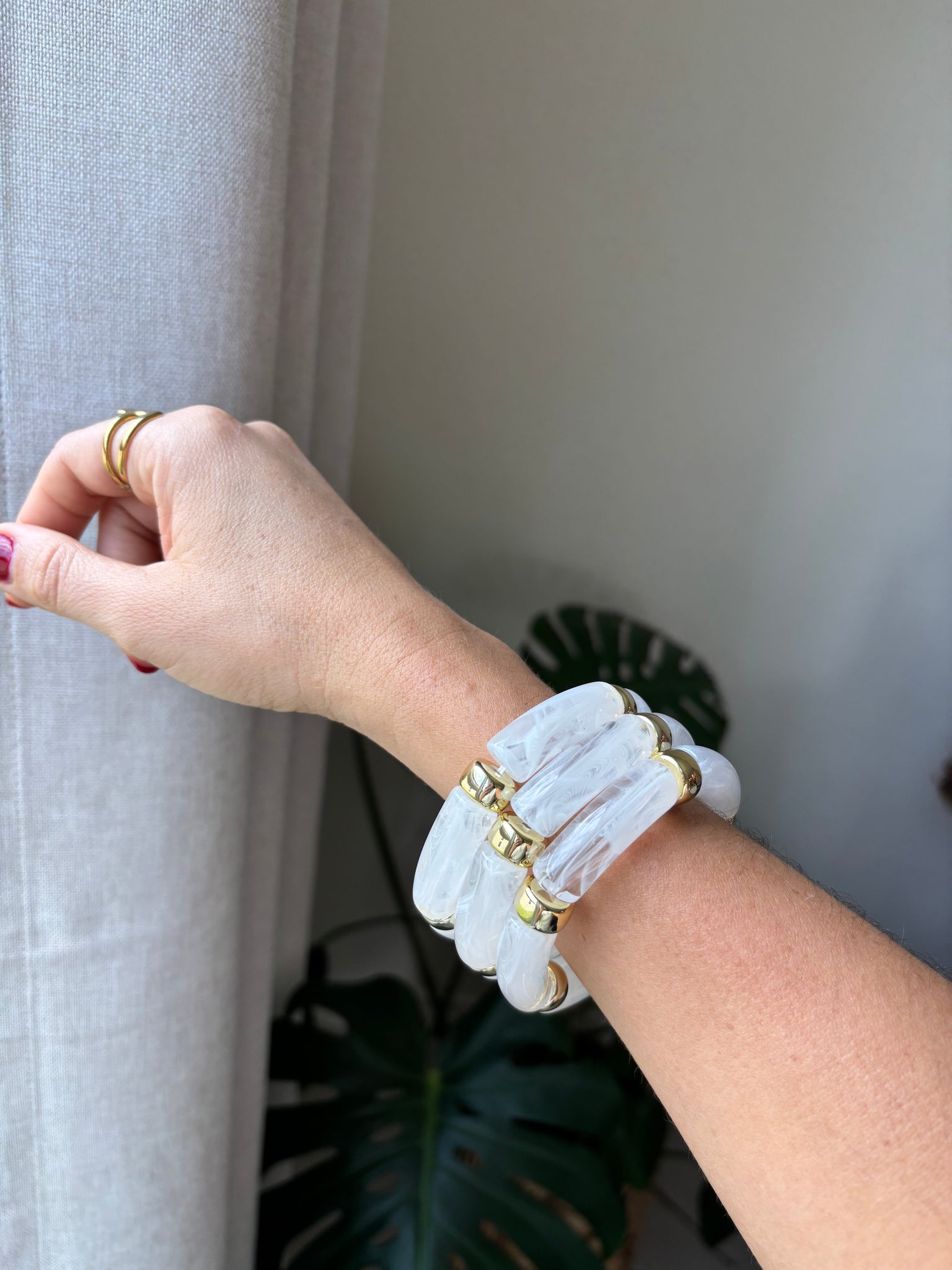 The Paz Bracelet Set includes three elastic bracelets crafted from durable acrylic acetate, featuring a sophisticated combination of gold-colored and milky-transparent beads. Designed for versatility and comfort, this set adds subtle elegance to any outfit while offering easy wear and long-lasting quality. Ideal for layering or wearing individually, these bracelets bring a refined accent to your accessory collection.