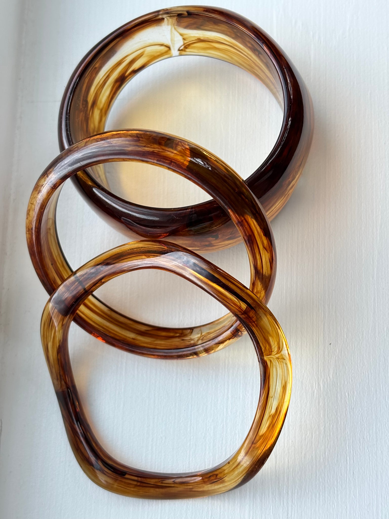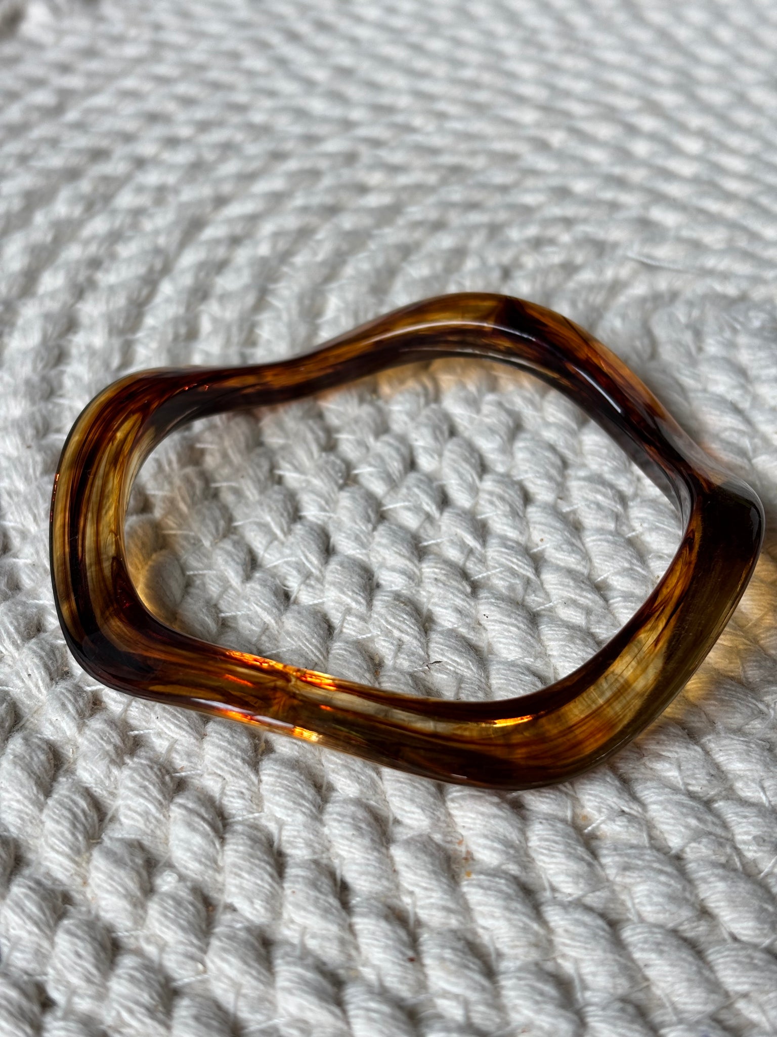 The Amelia Bracelet offers a distinctive accessory crafted from acrylic acetate with an irregular wide-brimmed design. Each piece features unique color shapes that may vary, ensuring no two bracelets are alike. This bracelet combines bold style with individuality.