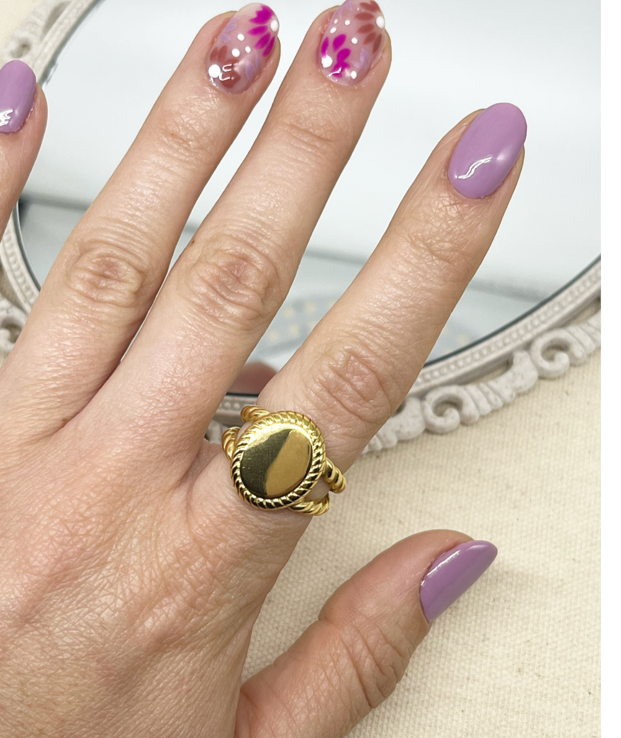 Oval ring in gold. A twist double band presents a large oval shaped to contour perfectly against your finger for a geometric look with timeless style.